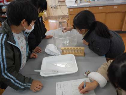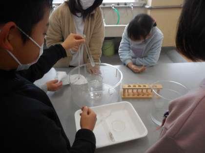試験管を温めたり冷やしたりして,せっけん水のまくがどうなるかを調べる実験をしました。試験管の口のまくが,膨らんだりへこんだりする様子がよく分かりました!