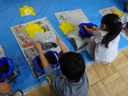 あさがおの種を観察した後,自分の植木鉢に種を植えました。「おおきくなあれ」「元気に育ってね」と願いをこめて植えていたのが素敵でした。今日から水やりを毎日頑張っていきます。
