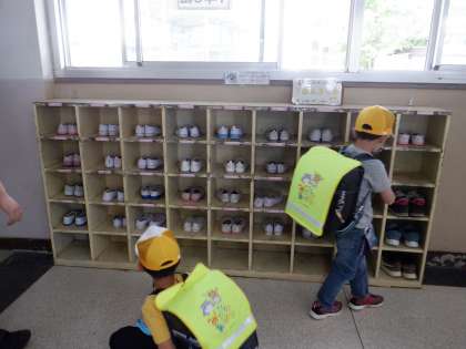 さようならの後,靴箱の前に男の子が2人!?よく見ると,靴箱の中の上靴が整頓されているか見てくれていました。きれいに並んだ靴箱はとても気持ちのいいものです。ありがとう。