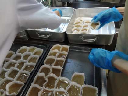 「ういろう」は米粉と黒砂糖,砂糖を混ぜてスチコンで蒸して作りました。