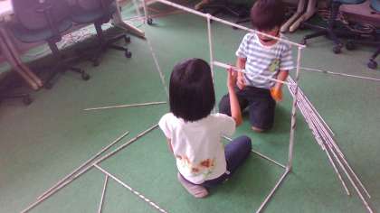 図画工作科では,新聞紙を棒にして,色々な形をつくりました。棒と棒を繋げることで,立体的な作品が出来ていました。