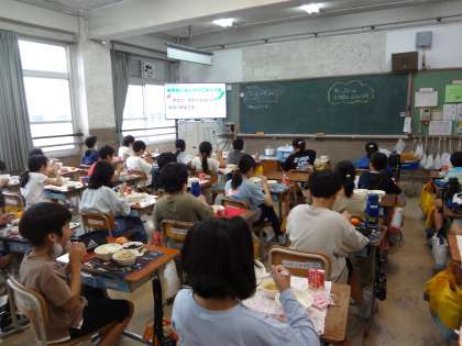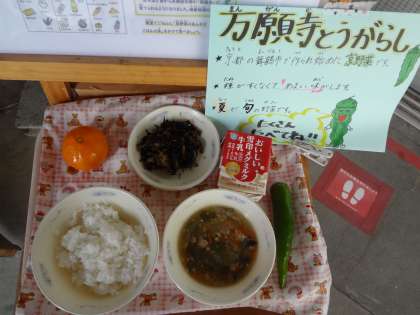 「夏野菜のあんかけ」には,京野菜の万願寺とうがらしや,夏野菜のなすがたっぷり入っています。【万願寺とうがらし】と【なす】は,油でサッと揚げてから,たまねぎやにんじんの入っただし汁に加えました。とうがらしやなすが苦手な子たちもおいしそうにペロリと食べきっていました。