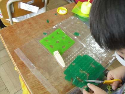 図画工作科では、光にあたってきれいに見えるように、はさみで切って作品を作りました。とてもきれいな作品が出来上がりました。
