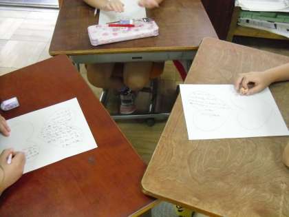 友達のいいところ、どんなところがありますか?と聞くと、「笑顔であいさつしてくれるよ。」「一緒に遊ぼうって声をかけてくれるよ。」など、たくさんのいいところが出てきました。今度、友達にいいところを書いたハートの紙を渡します!