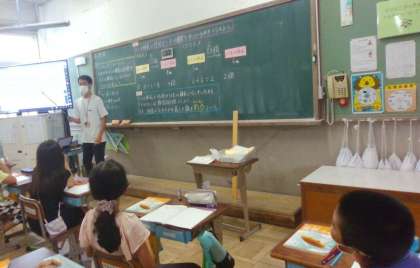今日から、割合の学習をしています。今回は、イルカとクジラについて、もとの体長の何倍が今の体長になっているかを比べました。