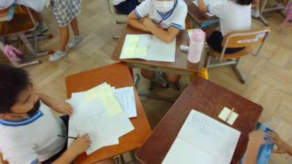国語『山小屋で三日間すごすなら』の学習では、5つしか持っていけないものに何を選ぶか班で話し合いました。