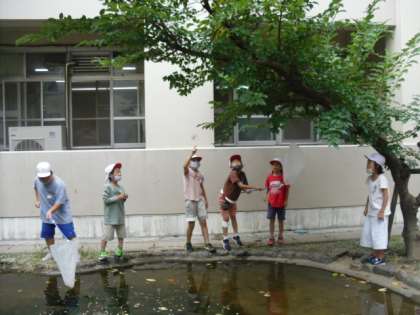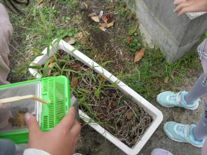 中庭に虫を探しに出かけました。今日みんなが見つけた蝶の名前は、「べにしじみ」です。なんていう名前の蝶なんだろう?と疑問に思った子供たちが、図鑑で調べてみんなに共有してくれました。