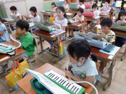鍵盤ハーモニカの演奏の仕方を確認しながら学習をしています。どれみふぁそまで音階が出てきました。指に番号をつけて,ひとつひとつ丁寧に演奏しています。「指がこんがらがってきたな。」「少しずつ分かってきたよ。」「演奏できるようになった!」など,練習を重なることで鍵盤ハーモニカとなかよくなってきました!