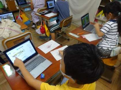 「いきものとなかよし」では、タブレットを使って本や図鑑を読み、調べ学習をしました。
