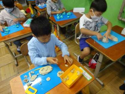 「ごちそうパーティーはじめよう!」では、粘土を丸めたり、ひも状にしたりしながら、思い思いのごちそうをつくりました。「ひもからモンブランにしたよ。」「平たくのばしてピザにしたよ。」といろいろな工夫があり、どれも美味しそうです。
