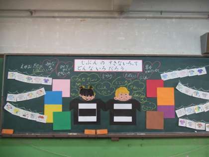 今月のテーマ「一人一人の思いを大切にしよう」に合わせて、1年生では一冊の絵本から学びました。自分の好きな色について考え、みんなの好きな色について交流しました。