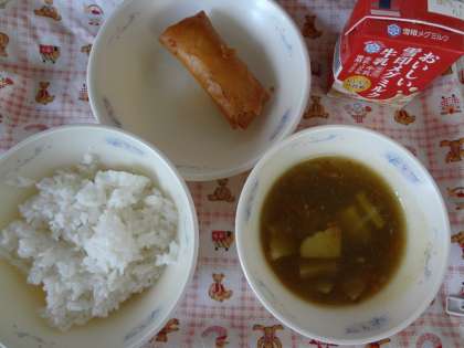 「牛乳」「ごはん」「春巻」「カレーあんかけごはんの具」です。