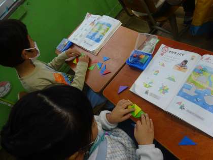「かたちづくり」では、実際に色板や棒を並べて、教科書に載っている形をつくったり、どんな形が作れるか考えたりしました。色板が何枚必要か考えたり、色板の向きを変えたりして工夫できていました。
