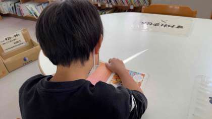 図書館で本を読んでいます。本を読むことで感じることがあると思います。これからも、様々な本に出会ってほしいと思います。