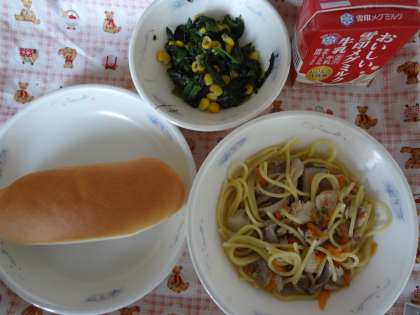 「牛乳」「小型コッペパン」「きのこのスパゲティ」「ほうれん草のソテー」です。
