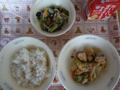 「牛乳」「玄米ごはん」「さけのちゃんちゃん焼き」「小松菜と切干大根の煮びたし」です。