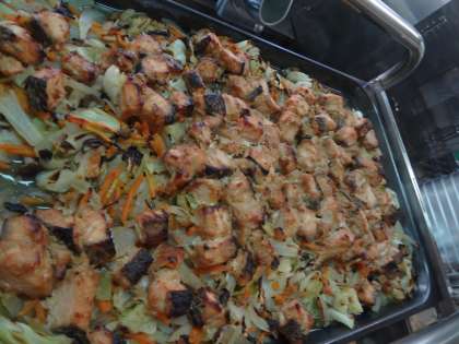 「さけのちゃんちゃん焼き」は、北海道の郷土料理の一つで、大きな鉄板でさけや野菜を焼き、みそ味をつける料理です。給食では、野菜の上にみそだれをからめた角切りのさけをのせて、スチコンで蒸し焼きにしました。