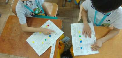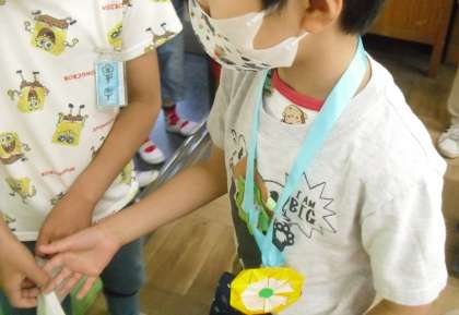 2年生からメダルをもらいました!みんなメダルをかけて探検しました。大切な宝物だね。探検から戻ってきた子どもたちは、友だちと地図を見せ合ってどこに行ったのか伝え合っていました。