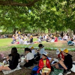 緑の美しい広場で昼食を食べました。