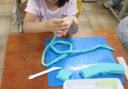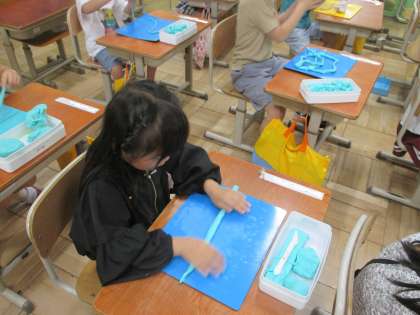 図画工作科「ひもひもねんど」の学習では、粘土を使って、いろいろな太さや長さに伸ばしていくことを楽しみました。そして、伸ばした粘土で、作りたい形を表現しました。