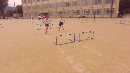 ハードル走に慣れてきた子どもたち。「トン・1・2・3」の3歩のリズムで調子よく走れるようになっています。