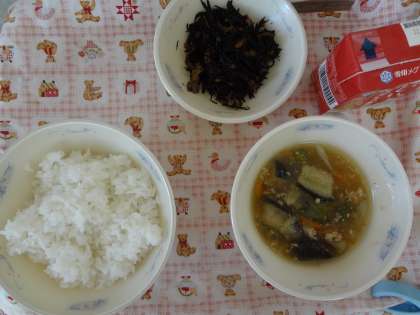 「ごはん」「牛乳」「夏野菜のあんかけごはんの具」「ひじきの煮つけ」です。