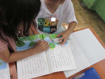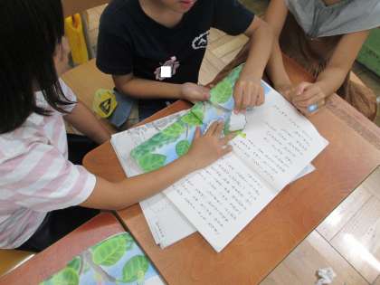 国語科「やくそく」の学習では、物語に出てくる『あおむし』や『おおきなき』になりきっての読み聞かせを友だちにしました。場面の様子や、物語に出てくる『あおむし』の気持ちを想像しながら、楽しく読むことができました。