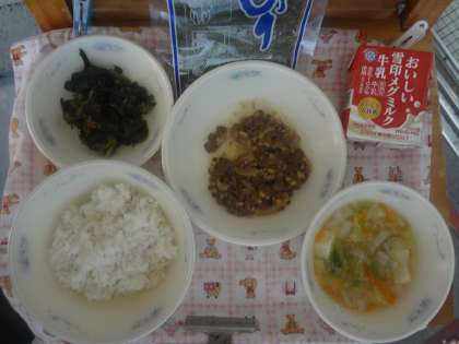 「麦ごはん」「牛乳」「肉みそなっとう」「手巻きのり」「ほうれん草のおかか煮」「はくさいの吉野汁」でした。