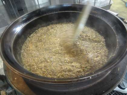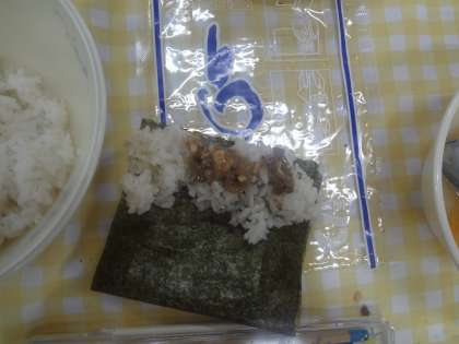 「肉みそなっとう」は、自分たちで「ごはん」と「具」をのりで巻いて食べる献立です。なっとう特有のくさみも少なく、人気な献立の一つです。