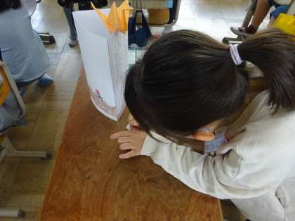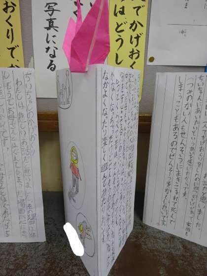 国語科「ちいちゃんのかげおくり」では、場面の様子や移り変わりから、ちいちゃんの気持ちを考え、どんなお話か考えを深めました。「小さな女の子の命が奪われて悲しいお話だと思った」や「家族の愛が感じられて温かいお話だと思った」などいろいろな感じ方がありました。最後は、お話を読んだ自分の考えを「ぐっときタワー」にまとめて交流しました。