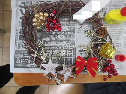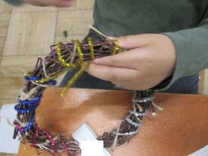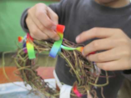 生活科の学習で、あさがおのつるを使ったリース作りをしています。