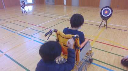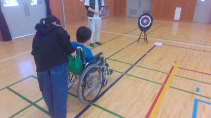 ハンドアーチェリー体験では、車椅子の補助の仕方も教えていただきました。