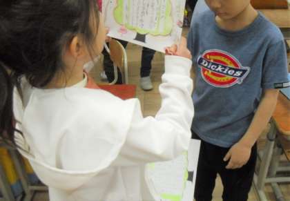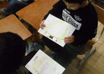 国語科の学習で、「おかゆのおなべ」を学習しました。おかゆのおなべを読んで、好きなところや面白かったところを見つけた後、外国の昔話を読み、紹介カードを書きました。友達にたくさん紹介出来ましたね!