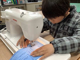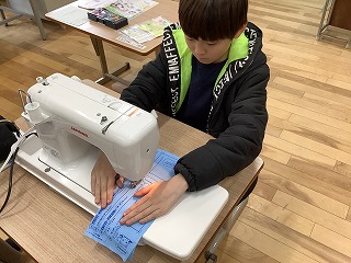 初めて使うミシンに緊張気味の子どもたちでしたが、何度も練習するうちに線に沿って縫うことができ、「上手くできた!」とうれしそうにしていました。