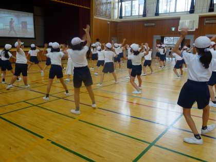 太秦フェスティバルの学年練習が始まりました。ソーラン節では、一つ一つの動きをかっこよく見せるために確認しながら踊っています。