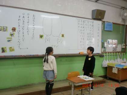 国語科「どんなおはなしができるかな」の学習では、絵に出てくる動物になりきって、どんなおななしにするのかを考え、自分のお話を文章で書くことに挑戦しています。ともだちと何回もいろんなお話をやりとりすることでイメージを膨らませ、「こんな会話にしよう。」「会話ってどうやって文章で書くのかな。」とがんばっています。できあがったお話は、おうちの人にも紹介します。
