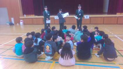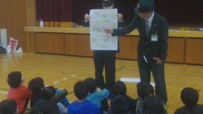 体育館ではバスに乗るときのマナーを教えていただき、その後バスに関わる〇×クイズをしました。子ども達は一生懸命考えながらバスに関するクイズを楽しんでいました。