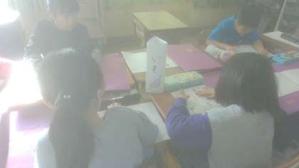 食べ物がどのように変身していくのかを本で調べて、カードに書きまとめました。食べものごとにコーナーを作り、読みたいところに移動しながらの交流をしています。