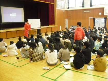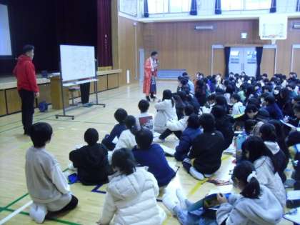 ゲストティーチャーの秋山さんに、駄菓子の神様についてのお話や子ども達を笑顔にする取り組みについてのお話をしていただきました。子ども達は大喜びでした。