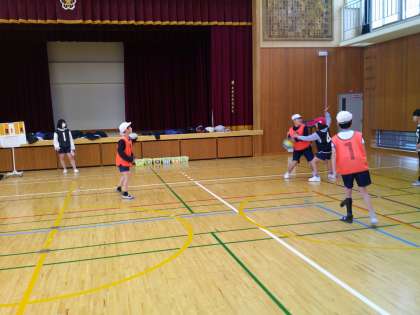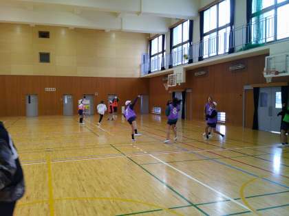 体育ではバスケットボールをしています。チームで作戦を考えながら、ルールを守って楽しんで学習を進めています!