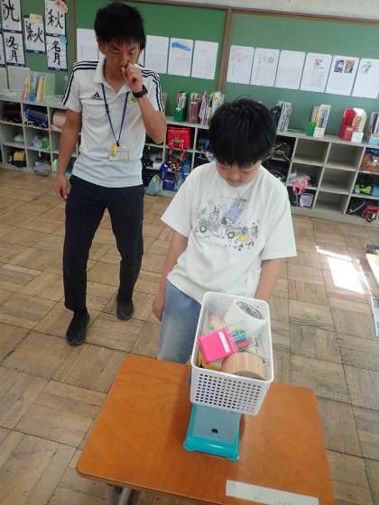 測った1キログラムの砂と比べながら、次は教室のものを複数合わせて、1キログラムに挑戦しています。