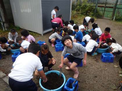 みんなが持ってきた土に、肥料を入れてみんなで土をまぜまぜしました。