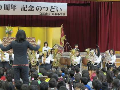2月7日(木)午前9時より体育館において,「創立140周年 記念のつどい」を開催しました。たくさんのご来賓を向かえ,盛大に開催することができました。今回,本校の卒業生であられる,サッカーの釜本邦茂氏をお迎えし,小学校時代のお話もお聞きすることができました。また金管バンドクラブの演奏や,今回のために結成された教職員による太秦バンドが会場を盛り上げる演奏をしてくれました。