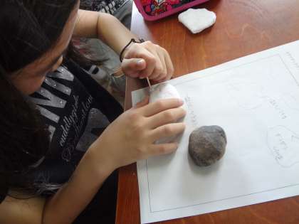 図工で石をじっくりと観察し,紙ねんどで本物そっくりに作っています。