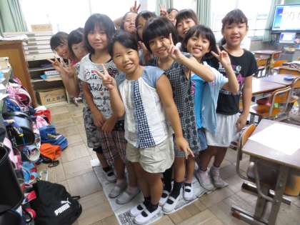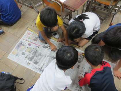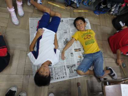 この日は,1平方メートルがどんな大きさかを体感するために,新聞紙で1平方メートルを作り,上に寝転がったり大勢で乗ってみたりしました。