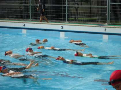 普段の授業は泳ぐことをねらいとしましますが,今回は浮くこと,救助を待つこと