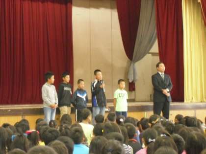 校長先生から,「後期の目標を立てましたか?」というお話があった後,運動会で立派に団長をつとめてくれた5人の6年生が,自分の後期の目標を発表してくれました。