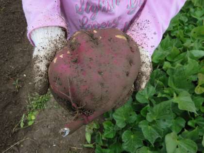 やっと,さつまいもの収穫の日を迎えました。今年は,夏の天候も悪く,おいもができているか不安でしたが・・・こんなに大きなおいもが土の中に隠れていました。
