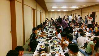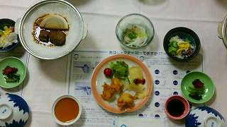 夕食の時間です。おいしいタコ飯も出できて豪華で食べきれないほどの食事でした。とてもおいしかったです。