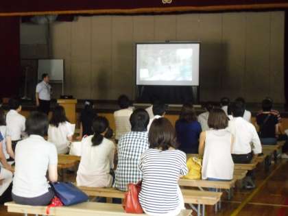 1時間目に,体育館において,河田PTA会長から「PTA活動について」のお話があり,だれもが参加しやすいPTA活動をめざしているというお話がありました。私は「学校教育方針」についてお話をさせていただき,今年度から学校教育目標が変ったことや,めざす子ども像等のお話をさせていただきました。今年も「あいさつ運動」に力を入れるべく,朝の登校時の子どもたちのあいさつの様子を動画でみてもらい,おもいやりの心を育てるひとつとして,トイレのスリッパをそろえていきたいとの話をさせていただきました。今回でしばらくお休みとなる「音楽集会」の様子もみていただき,体育館でのお話は体育館建て替え工事のため,しばらくできなくなります。